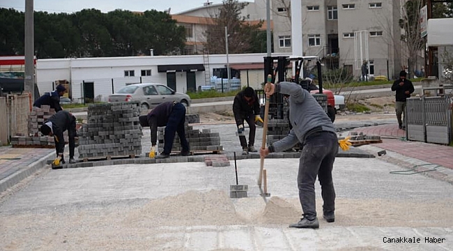 Ezine Belediyesi’ne bağlı ekipler, sokaklara kilit parke taşı döşüyor.