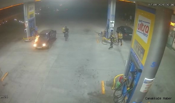 Olay dün akşam 20.30 sıralarında Çanakkale- İzmir karayolunda bulunan bir benzin istasyonunda meydana geldi. Yakıt pompasının yanına yaklaşan ve dolum işlemini tamamlayan sürücü, gitmeye hazırlanırken bir an da otomobilinin motor kısmında alevler çıkmaya başladı. Araçtan inen sürücü ile arka koltukta bulunan kadın, kucağındaki çocuğunu alarak can havliyle kaçmaya başladı. Arabanın alev aldığını gören benzin istasyonunda görevli iki kişi, yangın söndürme tüpleriyle yangına müdahale etti. Yangının kısa sürede söndürülmesiyle facianın eşiğinden dönüldü. Korku dolu o anlar da saniye saniye güvenlik kamerası görüntülerine yansıdı.