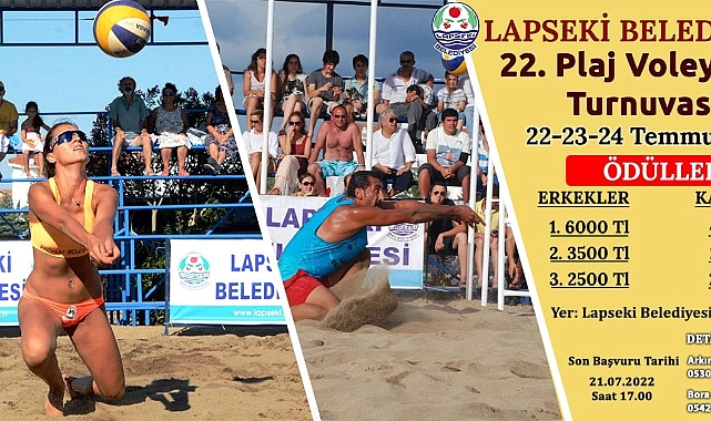 Lapseki ilçesinde bu yıl 22.’si gerçekleştirilecek olan Lapseki Belediyesi Plaj Voleybolu Turnuvası, 22 - 23- 24 Temmuz 2022 tarihleri arasında Lapseki Belediyesi Halk Plajında yapılacak. Lapseki Belediyesi’nden yapılan açıklamada; “Bu yıl 22.’si gerçekleştirilecek olan Lapseki Belediyesi Plaj Voleybolu Turnuvası, 22 - 23- 24 Temmuz 2022 tarihleri arasında Lapseki Belediyesi Halk Plajında yapılacaktır. Turnuvayı izlemeye tüm vatandaşlarımız davetlidir” denildi.