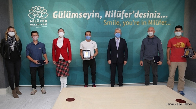 Nilüfer Belediye Başkanı Turgay Erdem, Görükle Spor Parkı'nda bulunan "Lider Tırmanma Duvarı"nı gönüllü olarak yenileyen Uğur İlerigelen, Mustafa Onur Çatak, Berat Yılmaz ve...