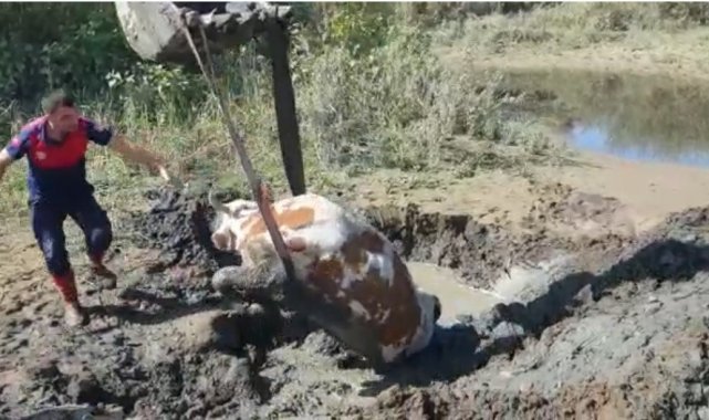 Bingöl'ün Genç ilçesi Murat Nehri kenarında otlanan bir inek çamura saplandı. İnek sahibi uğraşları sonucu hayvanı kurtarmayı başaramayınca durumu Genç Belediyesi itfaiye ekiplerine bildirdi. Bölgeye giden itfaiye ekipleri, iş makinesi yardımıyla ineği mahsur kaldığı çamurdan kısa sürede kurtararak sahibine teslim etti.