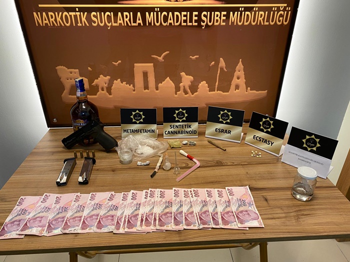 Ezine durdurulan bir araçta sahte banknot, kaçak içki ve uyuşturucu bulundu..