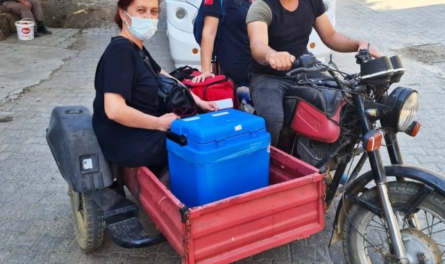Aydın'ın Nazilli ilçesinde aşılama ekibi, yol çalışması olan bölgeyi motosiklete binerek aştı, 108 vatandaşın Kovid-19 aşılarını yaptı.