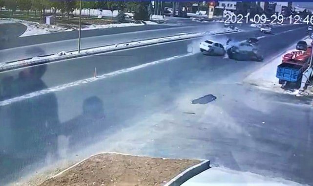 Şanlıurfa'da bir araç sürücüsü karşısına çıkan kamyonete çarpmamak için manevra yaparak karşı şeride geçerek iki araçla çarpışma anı güvenlik kamerasına yansıdı.