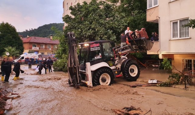 Kastamonu'nun Bozkurt ilçesinde meydana gelen sel felaketi sebebiyle binalarda mahsur kalan vatandaşlar, iş makinaları ile kurtarılıyor. Balkonlara dayanan kepçeler ile kurtarılan selzedeler ise şükredip dua etti.