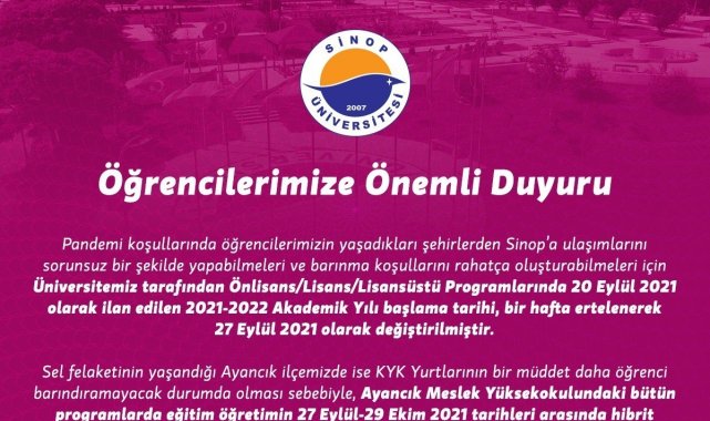 "Pandemi koşullarında öğrencilerimizin yaşadıkları şehirlerden Sinop'a ulaşımlarını sorunsuz bir şekilde yapabilmeleri ve barınma koşullarını rahatça oluşturabilmeleri için Üniversitemiz tarafından önlisans/lisans/lisansüstü programlarında 20 Eylül 2021 olarak ilan edilen 2021-2022 akademik yılı başlama tarihi, bir hafta ertelenerek 27 Eylül 2021 olarak değiştirilmiştir.