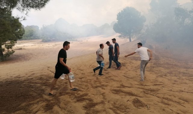 Vatandaşlar ellerinde dallar ve yerden topladıkları kumlarla yangına müdahale etti