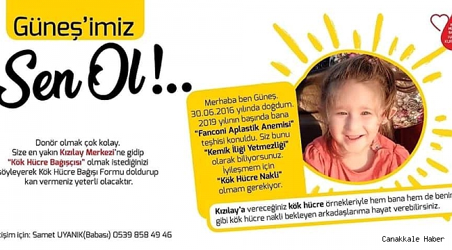 “Güneşimiz Sen Ol” isimli kampanya 3 yaşında kemik iliği yetmezliği hastalığına yakalanan ve iyileşebilmesi için sadece kök hücre nakli olması gereken Güneş Uyanık için başlatıldı. Kızılay’ın kan bağışı aracı 18 Ekim de Ayvacık’ta olacak. Güneş’in babası Samet Uyanık, Ayvacık Belediye Başkanı Mesut Bayram ile görüştü. Bu görüşmenin ardından Ayvacık Belediye Başkanı Mesut Bayram vatandaşlara seslendi ve vatandaşlardan bağış konusunda duyarlı olmasını istedi.