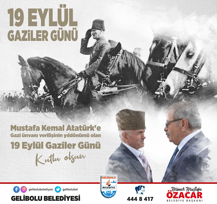 Gelibolu Belediye Başkanı Özacar, Millet Meclisi tarafından Büyük Önder Mustafa Kemal Atatürk’e, 19 Eylül 1921′de “Mareşal” rütbesi ile “Gazi” unvanı verilişinin 99.Yıldönümü olan 19 Eylül Gaziler Günü dolayısıyla bir mesaj yayınladı..