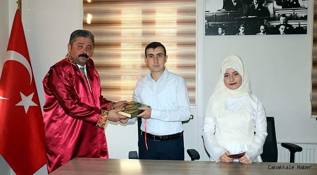 Bayramiç Belediyesi’nde bir ilke imza atıldı. Bayramiç Menderes Mahallesi Muhtarı Fatih Koç ve Nuriye Koç’un kızları Emine ile Ahmetçeli Köyünden Fatma ve Ramazan Altuncu’nun oğulları Mesut dün düzenlenen nikah töreniyle hayatlarını birleştirdi. Nikahı kıyan Bayramiç Belediye Başkanı Mert Uygun, yeni çifte Kuran-ı Kerim, Nutuk ve Türk Bayrağı hediye etti. Çifti tebrik eden Başkan Uygun, “Hayatınız boyunca bu değerli kitaplarımız size ışık olacak. Bu yoldan şaşmayın. Sizlere bir ömür boyu mutluluklar diliyorum” dedi.