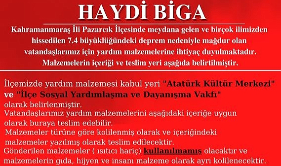 Biga Belediyesi’nden yapılan açıklamada, “Kahramanmaraş’ın Pazarcık ilçesinde meydana gelen ve birçok ilimizden hissedilen 7.7 büyüklüğündeki deprem nedeniyle mağdur olan vatandaşlarımız için yardım malzemelerine ihtiyaç duyulmaktadır. İlçemizde yardım malzemesi kabul yeri Atatürk Kültür Merkezi ve İlçe Sosyal Yardımlaşma ve Dayanışma Vakfı olarak belirlenmiştir. Vatandaşlarımız yardım malzemelerini içeriğe uygun olarak teslim edebilirler. Malzemeler türüne göre kolilenmiş olarak ve içeriğindeki malzemeler yazılmış olarak teslim edilecektir. Gönderilen malzemeler ısıtıcı hariç kullanılmamış olacaktır ve malzemelerin gıda, hijyen ve insani malzeme olarak ayrı ayrı kolilenecektir” denildi.
