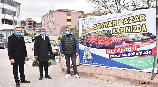Çan ilçesinde vatandaşların taze meyve ve sebze ihtiyaçlarını karşılamak adına Esnaf ve Sanatkarlar Odası işbirliği ile hayata geçirilen "Seyyar Pazar Kapınızda" projesi ile ilgili bilgi veren Çan Belediye Başkanı Bülent Öz; “Evde Kal Çan diyerek koronavirüs sürecinde hemşehrilerimizin her anlamda yanında olmaya ve mağduriyetlerini gidermeye devam ediyoruz. Çarşıya inerek pazar yapma imkanı bulamayan vatandaşlarımızın faydalanmaları adına düzenlediğimiz "Seyyar Pazar Kapınızda"... Siz evinizde pazar kapınızda! sloganı ile hemşehrilerimizin taze meyve ve sebze ihtiyaçlarını karşılamak adına Esnaf ve Sanatkarlar Odası işbirliği ile hayata geçirdiğimiz "Seyyar Pazar Kapınızda" projemiz Perşembe ve Cuma günleri uygulanmaya devam edecektir” dedi.