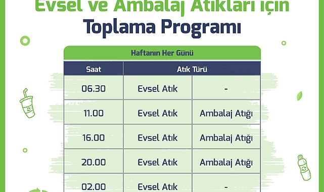 Özellikle bölge esnafı ve bu bölgede ikamet eden hemşehrilerimizin toplama saatine kadar ambalaj atıklarını evsel atıklardan ayrı olarak muhafaza edip araca teslim etmeleri, ortak kullanım konteyner noktalarına yakın olan esnaf ve bölge yaşayanlarımızın da atıklarını bu saatlere göre konteynerlere bırakmaları gerekmektedir.