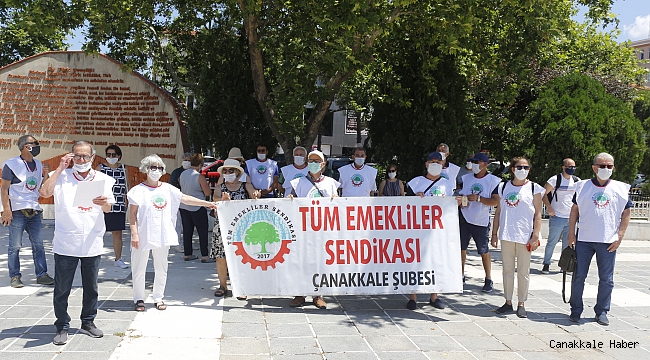 Tüm Emekliler Sendikası Çanakkale Şubesi üyeleri, Cumhuriyet Meydanı’nda toplanarak emekli maaşlarını protesto etti. Tüm Emekliler Sendikası Çanakkale Şube Başkanı Emin Ergun yaptığı açıklamada; “Mart ayı başında başlayan koronavirüs salgını ile gerek kişisel gerek toplumsal yaşamımızda önemli değişiklikler olmuştur. Anayasamızın amir hükmü olan sosyal devlet olmanın gereğiyle hareket etmesi gereken siyasi iktidar ne yazık ki tam tersi davranmış, bu salgından olumsuz etkilenen bütün kesimlerin kendi başının çaresine bakmayla baş başa bırakmıştır. Bu kesimin başında hiç şüphesiz emekliler gelmektedir. Zaten yetersiz olan emekli maaşları salgınla beraber iyice yetersiz hale gelmiş, açlık sınırında yaşayan emekliler özellikle sağlık giderleri ve koruyucu tedbirler için yetersiz maaşlarından harcama yapmak zorunda kalmışlardır. Ardı ardına açıklanan paketlerde ise emeklilerin hayatını kolaylaştıracak, rahatlatacak hiçbir önlem yer almamıştır. En düşük emekli maaşının 1.500 Tl olacağına dair açıklama “emeklilerin açlık sınırının altında yaşadığı” gerçeğinin yetkililer tarafından kabul edilmesidir. Aslında artış diye ifade ettikleri bu durum bir kandırmacayı ifade etmektedir. Şöyle ki: maaşı 1500 TL’ye yükseltilen emeklinin maaşına gerçek anlamda 1500 TL’ye ulaşıncaya kadar zam yapılmamakta, maaş artışlarından yararlanamamaktadır. Takdir edileceği gibi bu da bir iyileştirme değildir” dedi.