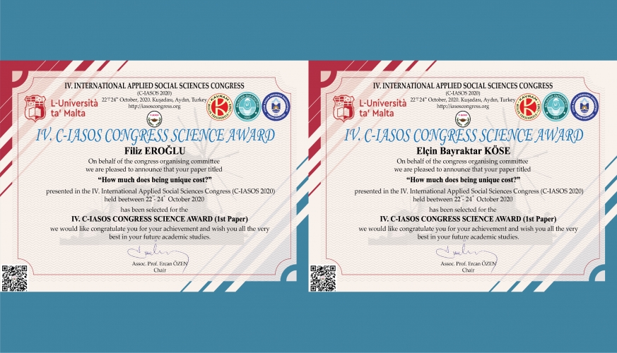 İşletme Bölümü Dr. Öğr. Üyesi Filiz Eroğlu ve Arş. Gör. Elçin Bayraktar Köse en iyi bildiri ödülünü aldı.