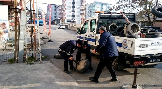 Erciş Belediyesi Zabıta Müdürlüğü ekipleri, hafta sonu sokağa çıkma kısıtlaması günlerinde cadde ve sokaklarda araç trafiğinde ve yaya kaldırımlarında geçişi engelleyen flama, duba, araç lastiği gibi maddeleri topladı. Zabıta müdürlüğüne bağlı ekipler tarafından gerçekleştirilen çalışmalar kapsamında ilçe merkezindeki bütün ana ve ara caddeler gözden geçirildi. Özellikle yol kenarlarına esnaflar tarafından bırakılan flama, duba, araç lastiği gibi maddeler toplanarak imha edildi.