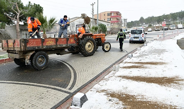 Ezine Belediyesi ekipleri, sahada karla mücadele çalışmalarını sürdürüyor.