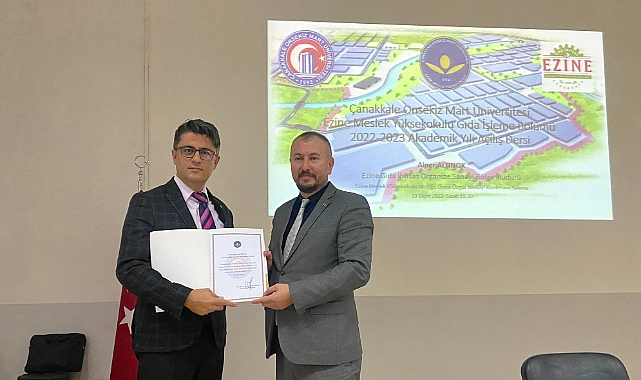 Çanakkale Onsekiz Mart Üniversitesi (ÇOMÜ) Ezine Meslek Yüksek Okulu’nda eğitim yılının ilk dersini Ezine Gıda İhtisas Organize Sanayi Bölgesi (EGİOSB) Müdürü Alper Altınok verdi. Ezine Meslek Yüksek Okulu’nda düzenlenen programda yeni başlayan öğrencilere Ezine Gıda İhtisas Organize Sanayi Bölgesi tanıtıldı. Ezine OSB’de kurulacak olan fabrikalar ve yapılacak olan üretim ile ilgili bilgiler paylaşıldı. Programın açılış konuşmasını Ezine Meslek Yüksek Okulu Müdürü Prof. Dr. R. Cüneyt Erenoğlu gerçekleştirdi.