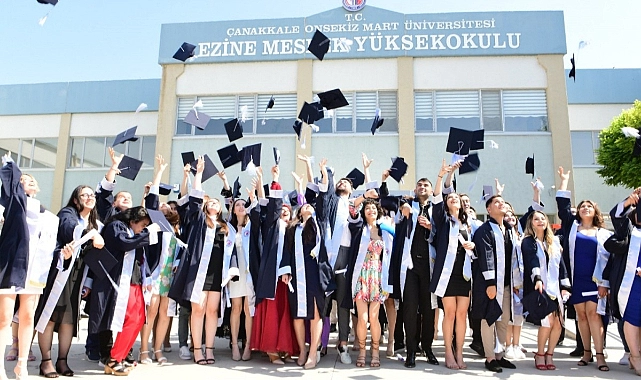 Törene Çanakkale Onsekiz Mart Üniversitesi Rektörü Prof. Dr. R. Cüneyt Erenoğlu, Ezine Kaymakamı Yunus Kızılgüneş, Ezine Belediye Başkanı Güray Yüksel, akademisyenler ile idari personelin yanı sıra mezun öğrencilerin aileleri katıldı. Saygı duruşu ve İstiklal Marşının okunmasıyla başlayan mezuniyet töreni Ezine Meslek Yüksekokulu’nun tanıtım filminin izlenmesiyle devam etti. Yüksekokul mezunları adına okul birincisi Büşra Şenel’in konuşma yaptığı törende sırasıyla ÇOMÜ Rektörü Prof. Dr. R. Cüneyt Erenoğlu ve Ezine Kaymakamı Yunus Kızılgüneş de birer konuşma gerçekleştirdiler. Rektör Prof. Dr. Erenoğlu törende yaptığı konuşmada Ezine Belediyesi ve Ezine Kaymakamlığı’nın bugüne dek meslek yüksekokulu projelerine sunduğu katkılardan dolayı teşekkür etti ve mezunları tebrik etti. Erenoğlu, bundan sonra gerçekleşecek her projeye de tam destek sözü verdi. Okul birincisi olarak dereceye giren Büşra Şenel, mezuniyet belgesini ve hediyesini Ezine Belediye Başkanı Güray Yüksel ve Rektör Erenoğlu’nun elinden aldı. Tören, okul binasının önünde kep atma seremonisi ve toplu fotoğraf çekimleri ile sona erdi.