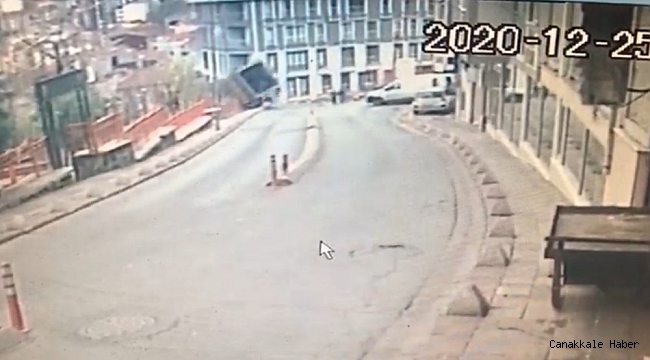 Kağıthane'de Talatpaşa Mahallesi Zeybek Sokak'ta sabah saatlerinde yaşanan olayda ev taşınması için eşya yüklenen nakliyat kamyonu kaymaya başlamış ve yaklaşık 10 metre yükseklikten boş alana uçmuştu. Kazaya ilişkin güvenlik kamera görüntüleri ortaya çıkıt. Görüntülerde kamyon eşya taşındığı sırada birden yokuş aşağı kaymaya başlıyor. Şoför ve yanındaki kişiler kamyonun peşinden koşuyor. Bir süre sonra kaldırımı aşan kamyon, boş alana uçuyor.