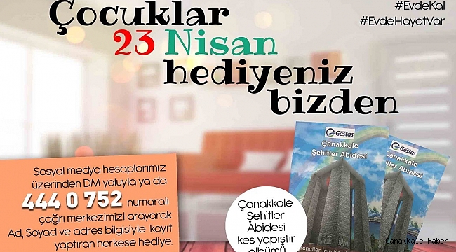 Gestaş, 23 Nisan Ulusal Egemenlik ve Çocuk Bayramı nedeniyle, sosyal medya hesapları üzerinden mesaj yoluyla ya da 444 0 752 numaralı çağrı merkezini arayarak ad, soyad ve adres bilgisiyle kayıt yaptıran herkese “Çanakkale Şehitler Abidesi Kes Yapıştır Albümü” hediye edecek. Gestaş’tan yapılan açıklamada; “Gestaş Deniz Ulaşım olarak, çocuklarımızın 23 Nisan Ulusal Egemenlik ve Çocuk Bayramı’nı minik bir hediyeyle kutlamak istedik. Bu yıl maalesef sokaklarda olamayacağımız ancak aynı coşkuyla evlerimizde kutlayacağımız 23 Nisan Ulusal Egemenlik ve Çocuk Bayramı vesilesiyle, sosyal medya hesaplarımız üzerinden mesaj yoluyla ya da 444 0 752 numaralı çağrı merkezimizi arayarak Ad, Soyad ve adres bilgisiyle kayıt yaptıran herkese “Çanakkale Şehitler Abidesi Kes Yapıştır Albümü” hediye… Talep oluşturan çocuklarımız veya ailelerimize, kes yapıştır albümleri kargoyla iletilecektir. “Çanakkale Şehitler Abidesi Kes Yapıştır Albümü” çocukların evdeki vakitlerini daha eğlenceli hale getirebilecekleri, el becerilerini geliştirecekleri, makas ve çeşitli yapıştırıcıları kullanarak Çanakkale Şehitler Abidesi’ni oluşturdukları bir karton maket oyunudur” denildi.