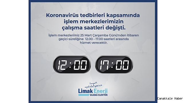 Bursa, Balıkesir, Çanakkale ve Yalova’da 5 milyon kişiye hizmet veren sektörünün öncü şirketlerinden Limak Enerji, koronavirüse karşı toplum sağlığını korumak amacıyla işlem merkezlerinin hizmet saatlerinde güncellemeye gitti. Limak Enerji, yarından itibaren geçerli olmak üzere 12.00- 17.00 saatleri arasında hizmet verecek.