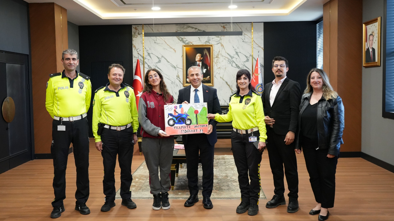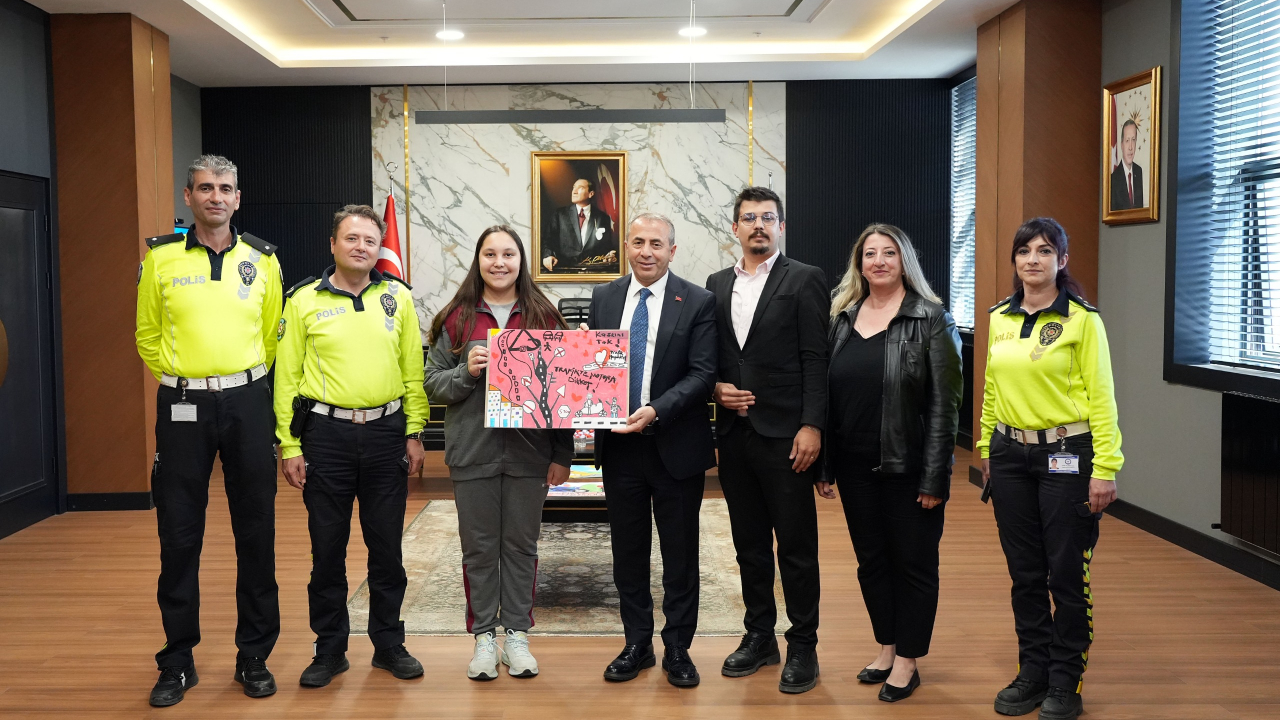 Trafik Tescil ve Denetleme Şube Müdürlüğü koordinesinde, İl Milli Eğitim Müdürlüğüne bağlı okulların 7. sınıf öğrencileri arasında düzenlenen “Trafik” konulu resim yarışmasında dereceye giren öğrenciler, İl Emniyet Müdürü Kenan Kurt’u ziyaret ederek yaptıkları eserleri kendisine hediye etti.