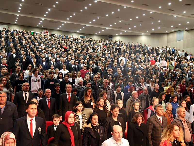 Vali Orhan Tavlı, Boğaz ve Garnizon Komutanı Tuğamiral Levent Kerim Uça, Çanakkale Belediye Başkanı Ülgür Gökhan, Cumhuriyet Başsavcısı Ömer Karişit, protokol üyeleri, vatandaşlar ve öğrencilerin katıldığı anma programı saygı duruşu ve İstiklal Marşı’nın okunmasıyla başladı. Gazi Mustafa Kemal Atatürk’ü anma programında Cumhurbaşkanı Recep Tayyip Erdoğan’ın anma mesajı okundu. Cumhurbaşkanı Erdoğan anma mesajında; “Cumhuriyetimizin banisi Gazi Mustafa Kemal Atatürk’ü ebediyete irtihalinin 81. yıl dönümünde saygıyla yad ediyorum. Aziz milletimizin tüm fertleriyle topyekûn bir mücadele verdiği Kurtuluş Savaşı’nı zafere ulaştıran Gazi Mustafa Kemal Atatürk, milletimizden aldığı güçle büyük başarılara imza atmış, dünya tarihinde saygın bir yer edinmiştir. Aziz milletimizin ve tüm dünyanın takdirine mahzar olmuş bir lider olan Gazi’yi anlamalı, milli irade aşığı bir şahsiyet, bir insan olarak gençlerimize ve çocuklarımıza anlatmalı; yaşanan zorlukları ve verilen eşsiz mücadeleyi unutmadan, birlik ve beraberlik içinde istikbal yolunda yakılan meşaleyi yeni nesillere emanet etmeliyiz. Milletimiz şehitlerimizin kanları ve gazilerimizin fedakarlıklarıyla savunulan bu vatan ve bayrağı sonsuza kadar korumaya kararlıdır. Türkiye Cumhuriyeti, geçmişinden aldığı güçle tüm engelleme teşebbüslerine rağmen sağlam adımlarla ilerlemeyi ve büyümeyi sürdürmektedir. Geleceğe her zamankinden daha büyük bir ümitle, daha büyük bir kararlılıkla yürürken bizler de bugün, Gazi Mustafa Kemal Atatürk’ün ‘en büyük eserim’ dediği Cumhuriyetimize sahip çıkıyor, ülkemizi daha ileriye taşıyacak adımları yılmadan, yorulmadan hayata geçiriyoruz. Bu düşüncelerle, vefatının 81. yıl dönümünde Cumhuriyetimizin banisi Gazi Mustafa Kemal Atatürk ve silah arkadaşları ile vatanımız uğruna fedakarca şehit ve gazi olan tüm kahramanlarımızı bir kez daha rahmetle, minnetle yad ediyorum” ifadelerini kullandı. İÇDAŞ Kongre Merkezindeki anma töreni, İbrahim Bodur Anadolu Lisesi öğrencileri tarafından hazırlanan anma programıyla son buldu.