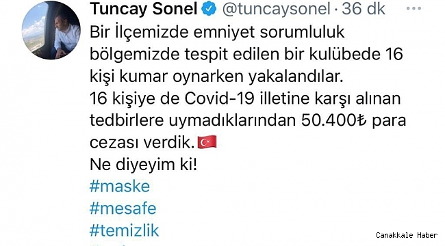Vali Tuncay Sonel sosyal medya hesabından yaptığı paylaşımda, oynandığını tespit edildiğini ifade etti. Vali Sonel açıklamasında, "Bir ilçemizde emniyet sorumluluk bölgemizde tespit edilen bir kulübede 16 kişi kumar oynarken yakalandılar. 16 kişiye de Kovid-19 illetine karşı alınan tedbirlere uymadıklarından 50 bin 400 para cezası verdik. Ne diyeyim ki" ifadelerine yer verdi.