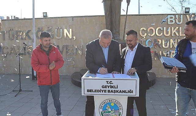 Geyikli Belediye Başkanı Mevlüt Oruçoğlu ve Hizmet-İş Sendikası Çanakkale Şube Başkanı Vedat Yılmaz tarafından imzalanan toplu iş sözleşmesi sayesinde, Geyikli Belediyesi’nde çalışan emekçiler 37 bin TL ve 45 bin TL’nin altında maaş almayacak.