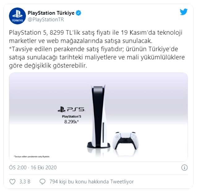 Sony, tweetinde son olarak ürünün fiyatının tavsiye edilen satış fiyatı olduğunu, Türkiye'de satışa sunulacağı tarihteki maliyetlere ve mali yükümlülüklere göre değişiklik gösterebileceğini söylüyor.