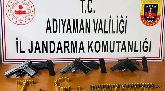 Edinilen bilgilere göre, İl Jandarma Komutanlığı ekiplerince Adıyaman'ın Kahta ilçesine bağlı Narince Köyünde yapılan devriye görevi esnasında durumundan şüphelenilerek durdurulan 3 şahsın üst araması yapıldı. Gerçekleştirilen üst aramalarında 3 adet ruhsatsız tabanca ve bu tabancalara ait 100 adet mermi ele geçirildi. Tabancalara ve mermilere el konulurken 3 şahıs hakkında adli işlem gerçekleştirildi.
