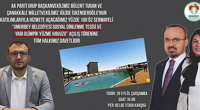 Lapseki ilçesine bağlı Umurbey beldesi önemli bir açılışa ev sahipliği yapacak. Umurbey Belediyesinin kendi imkânlarıyla yapımını tamamladığı Sosyal Dinlenme Tesisi ile Yarı Olimpik Yüzme Havuzu 26 Eylül Çarşamba günü saat 16.00'da AK Parti Grup Başkanvekili Bülent Turan ve Çanakkale Milletvekili Jülide İskenderoğlu'nun katılımıyla yapılacak açılış töreniyle hizmete girecek. Belediyenin sosyal medya hesabından açılış törenine ilişkin yapılan açıklamada şu ifadeler kullanıldı: “AK Parti Grup Başkanvekilimiz Bülent Turan ve Çanakkale Milletvekilimiz Jülide İskenderoğlu'nun katılımlarıyla hizmete açacağımız yüzde 100 özsermayeli "Umurbey Belediyesi Sosyal Dinlenme Tesisi ve Yarı Olimpik Yüzme Havuzu" açılış törenine tüm halkımız davetlidir.”