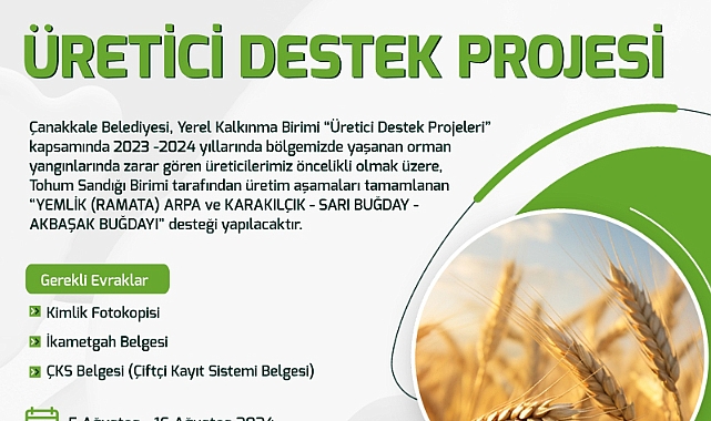 Çanakkale Belediyesi Yerel Kalkınma Birimi tarafından hazırlanan “Üretici Destek Projeleri” kapsamında 2023-2024 yıllarında bölgemizde yaşanan orman yangınlarında zarar gören üreticiler öncelikli olmak üzere, Tohum Sandığı Birimi tarafından üretim aşamaları tamamlanan yemlik (ramata) arpa ve karakılçık, sarı buğday ve akbaşak buğdayı desteği yapılacak. Üreticilere yönelik projenin başvuruları ise 5-16 Ağustos 2024 tarihleri arasında gerçekleşecek.