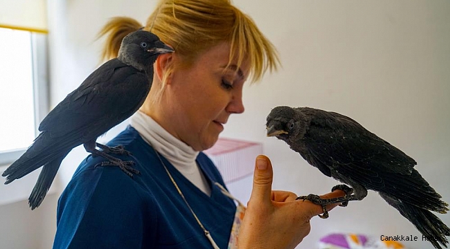 Çanakkale Doğa Koruma ve Milli Parklar Şube Müdürlüğü Veteriner Hekimi Meltem Dimişgi tarafından üç haftalıkken teslim alınan yavru kargalardan ‘Kimyon’un en büyük keyfi ise veteriner hekimin omzunda iken mama yemek. Yavru hayvanlara gözü gibi bakan Dimişgi, “Duyarlı vatandaşlarımız tarafından kurumumuza gelen ihbar neticesinde, görmüş olduğunuz bu sepetteki yavru kargalarımız 3 haftalıkken buraya getirildi. Omuzunda bulunan ‘Kimyon’ isimli kargamız da Biga Şefliğimiz tarafından Çanakkale Merkez Şubemize getirildi. Yaklaşık 1 aydır bakım ve beslemelerini yapmaktayız. 2 veya 3 hafta sonra yavrularımız artık uçmak üzere hazır olduklarında, doğal yaşam ortamlarına kurumumuz tarafından salınacaktır” dedi.