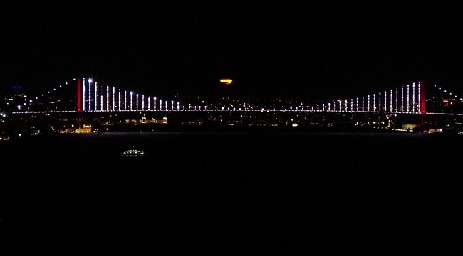 İstanbul Boğazı'nda dolunayın 15 Temmuz Şehir Köprüsü üzerinden doğuşu kendine hayran bıraktı. Boğaz'da yürüyüşe çıkan vatandaşlar dolunayın göz kamaştıran manzarasını hayranlıkla izleyip fotoğrafını çekti. 15 Temmuz Şehitler Köprüsüyle dolunayın aynı karede buluşması ise kartpostallık görüntüler oluşturdu. Dolunayın doğuş anında oluşturduğu kartpostallık görüntüler havadan drone kamerası ile görüntülendi.